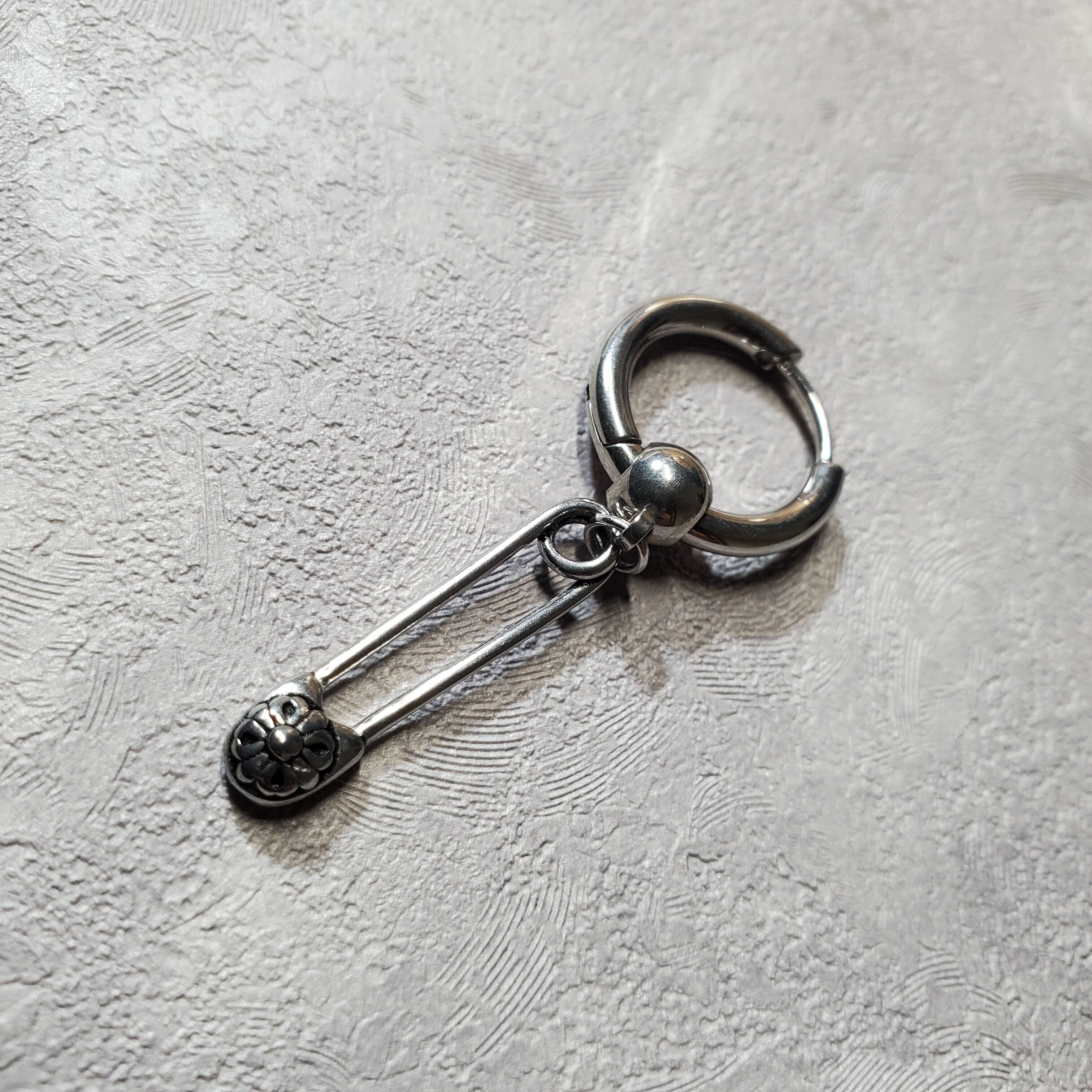 安全ピン風の飾りがついたステンレスフープピアス 飾りは外せるのでフープピアスのみでも使用可能